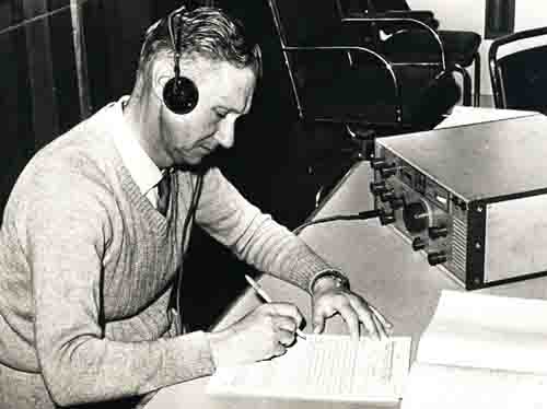 Mr Arthur Fairman taking down a morse coded telegram from a ship at sea.